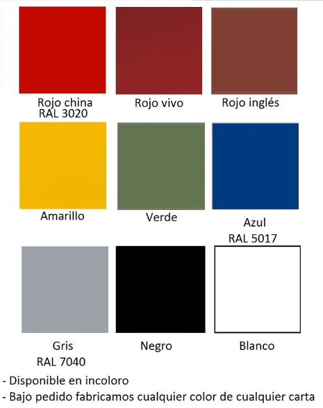 | COLOR | Amarillo, Azul, Azul piscinas, Azul piscinas alta calidad, Barniz, Gris, Selladora transparente, Verde, Negro, Blanco, Rojo vivo, Rojo china, Rojo inglés |