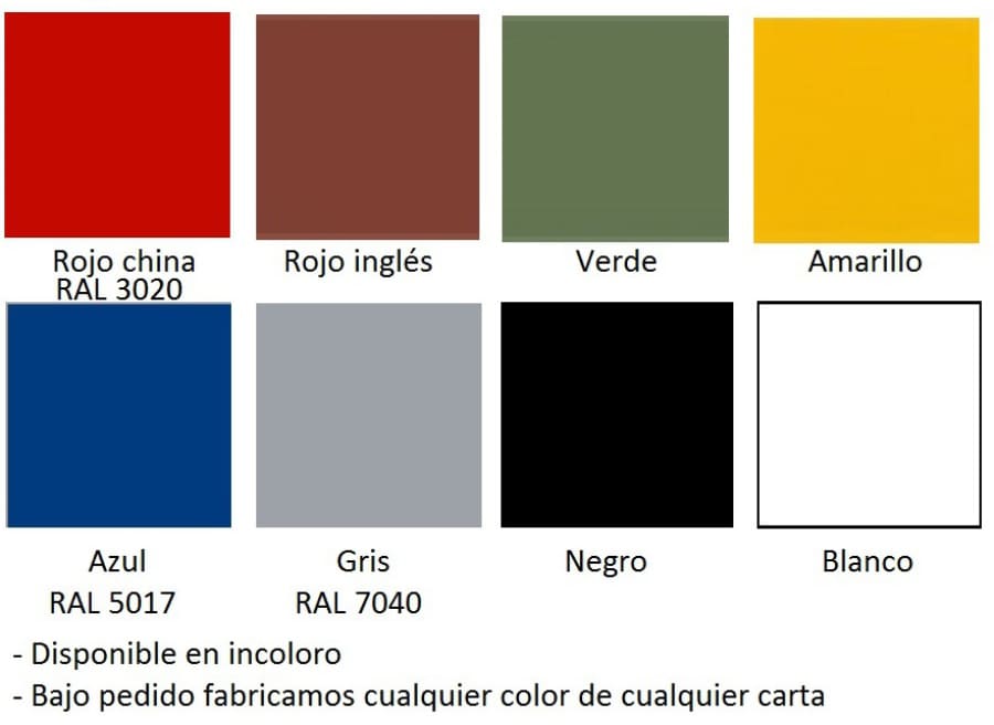 | COLOR | Barniz epoxi, Epoxi amarillo, Epoxi amarillo limón, Epoxi azul (RAL 5017), Epoxi blanco, Epoxi gris (RAL 7040), Epoxi negro, Epoxi rojo china (RAL 3020), Epoxi rojo inglés, Epoxi verde, Epoxi verde amarillento (RAL 6018), Imprimación epoxi rica en zinc |